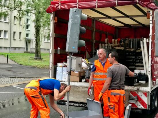 Mein Einsatzgebiet führte mich mit den Kollegen heute durch das halbe Stadtgebiet. Unter anderem: Verkehrssicherung an der Leipziger Straße, Havarie-Absperrung an der Weststraße und Baustellenvorbereitung auf der Hauboldstraße. Mobile Ampeln einrichten, Baken verteilen, Bauzäune aufstellen. Sehr interessant, gerade was die Funktionsweise der mobilen Ampeln, und extrem anstrengend, was die Standelemente für die Absperrungen angeht. Ein Standfuß wiegt um die 30 kg, und pro Baustelle sind da schon mal zehn aus- und einzuladen.